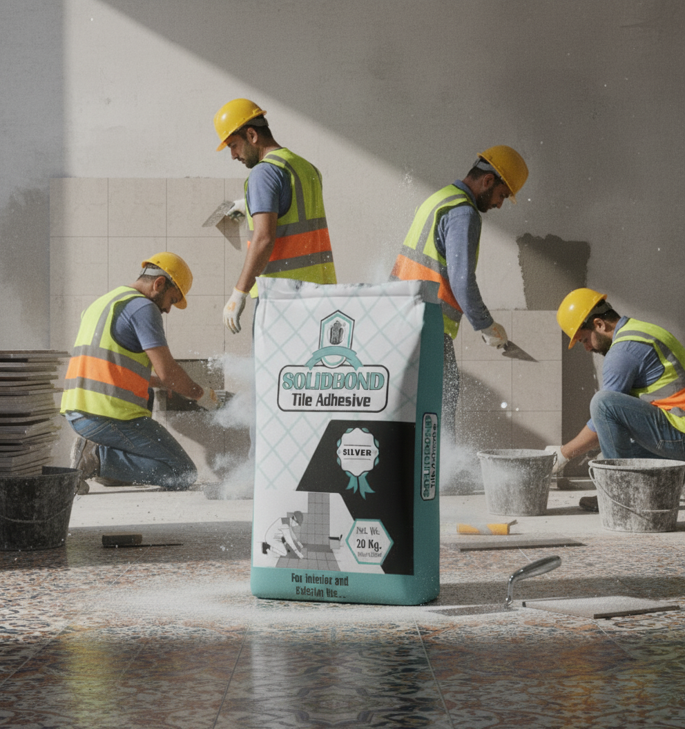 Solidbond Silver is a high-polymer modified, grey cement-based adhesive specially designed for reliable tile fixing. It bonds perfectly with ceramic, natural stone, and vitrified tiles — suitable for both interior and exterior applications.